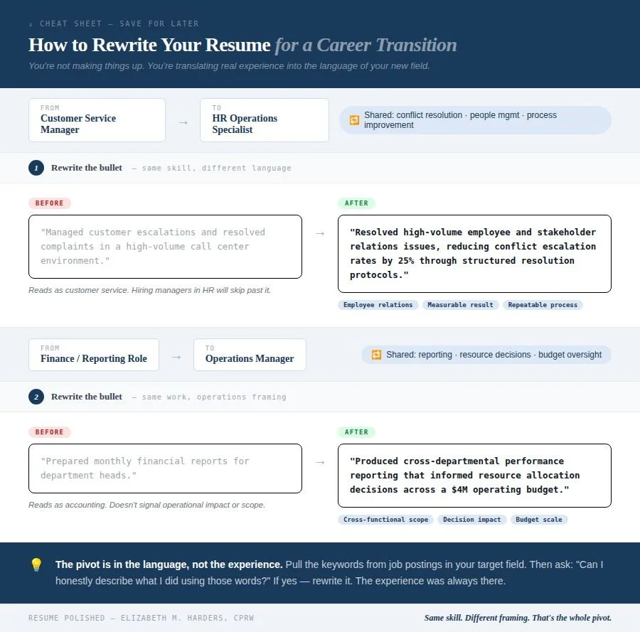 This is one of the most searched questions related to career change resumes, so let's look at what the pivot actually looks like on the page.